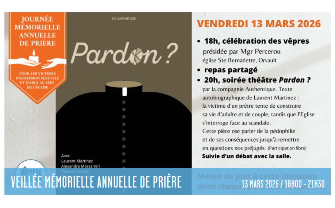 Une célébration (vêpres) aura lieu le vendredi 13 mars à 18h, à l’église Sainte-Bernadette à Orvault, présidée par Mgr Percerou. Par ce temps de prière ouvert à tous, préparé par des membres de la cellule d’accueil et d’écoute, une victime, le service de liturgie, d’autres services, et la paroisse Bienheureux-Célestin-et-Michel-en-Val-de-Cens, nous demanderons au Christ de répandre sa grâce sur les membres de son corps blessé.